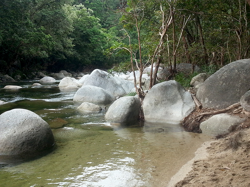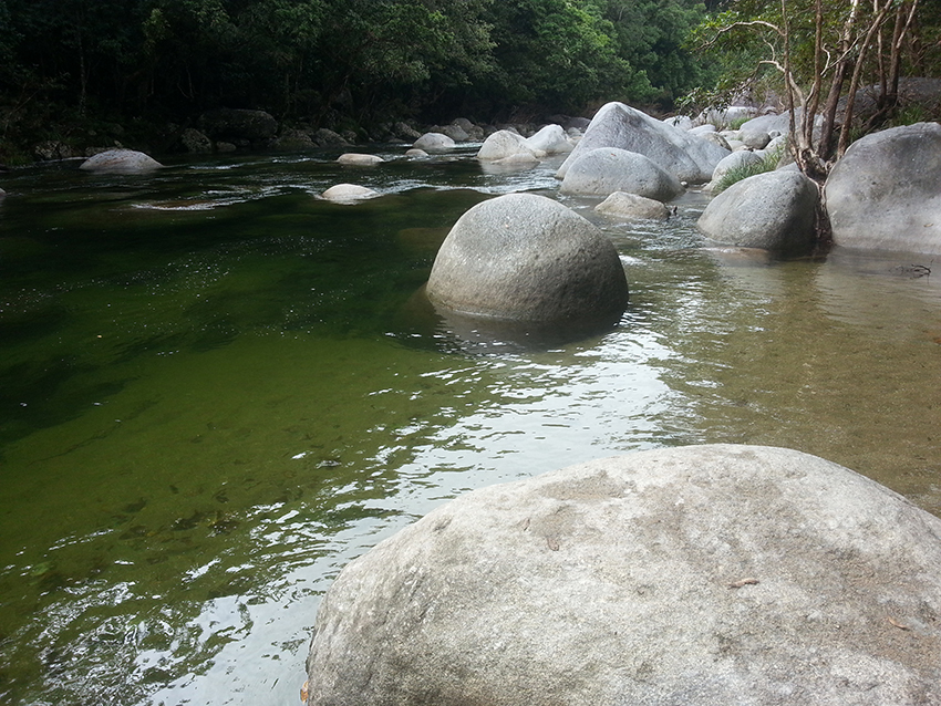 טאונסוויל למישן ביץ', עלינו לטייבלנד, רמה של יער גשם טרופי, מין גבעות טירוליות ירוקות מוקפות הרים שחורים, מפלי קניונים, ברכות סלע וג'ונגל מלא בחיות יום ולילה, עופות קזוארי אימתניות, תרנגולי הודו פראיים, קוקברות, ברווזנים, קנגורו עצים, נהרות שורצי תנינים וכן הלאה. בחניון מלנדה המשקיף על המפל המקומי מקנחים בסלט פרות טרופיים שקנינו בדוכן כביש מקומי. בננות, פאפייה, ענבים, זורים על הכל קורנפלקס, מוסיפים יוגורט יווני ומטפטפים דבש… אחחח… בכלל, הג'ונגל כאן הוא סימן דרך גסטרונומי מבחינתנו. לצהרים הזמנו את עצמנו לפלטת גבינות שרכשנו במחלבה קטנה באמצע הגבעות הירוקות.. יש עוד את מרק הקישואים הנפלא שמיקי הכינה מירקות שקנינו בשוק של יום א' בטאונסוויל. סופסוף מצאנו שמיר.. בלי זה לא יתכן מרק קישואים..