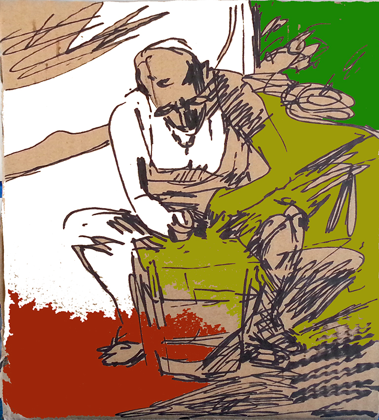 פילטור. צבע-אצבע על גבי קרטון ממוחזר, איזו חתיכת קופסה מהסופר המקומי. קיטשי בערך כמו תופעת הטבע המתעתעת והאיש הקטן המתנהל בתוכה.