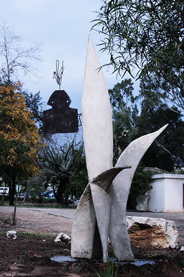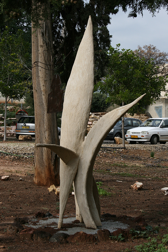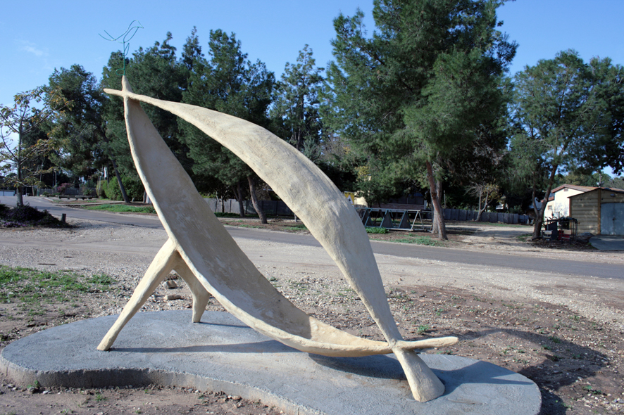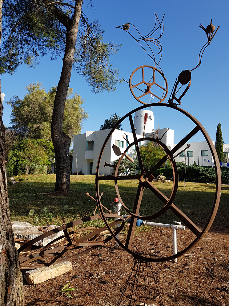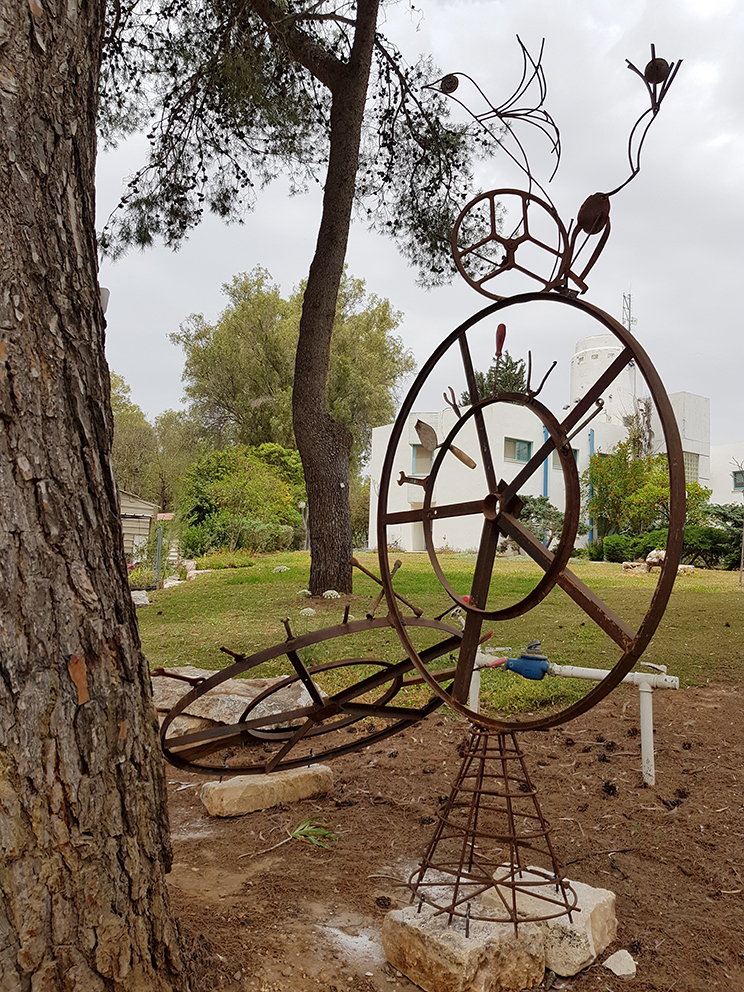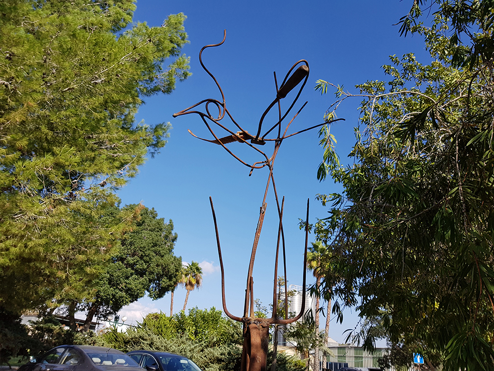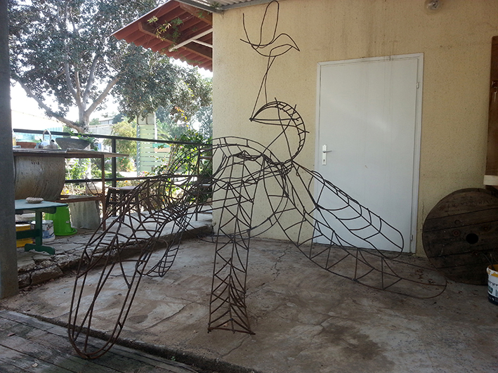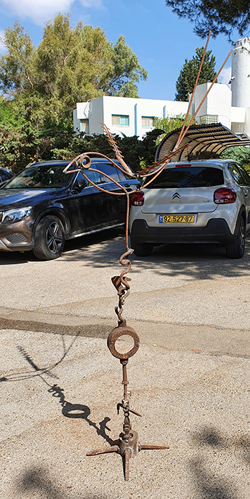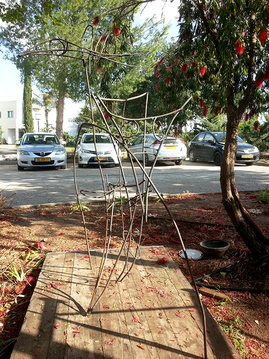 יד. קלקר על שלד ברזל. העבודה נחתכה ונוצקה באלומיניום. החלקים הונחו במתחם ליד בריכת המים של קיבוץ נען.