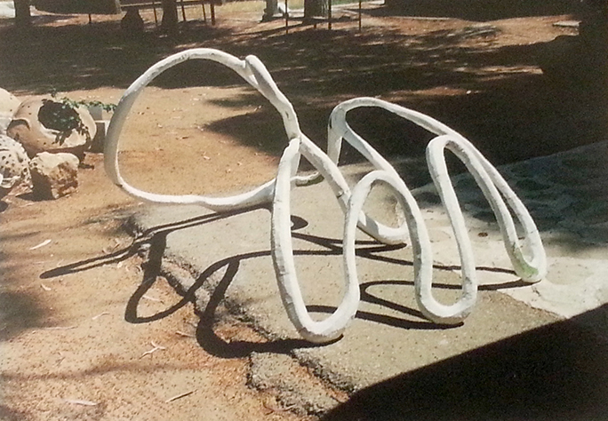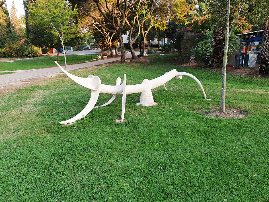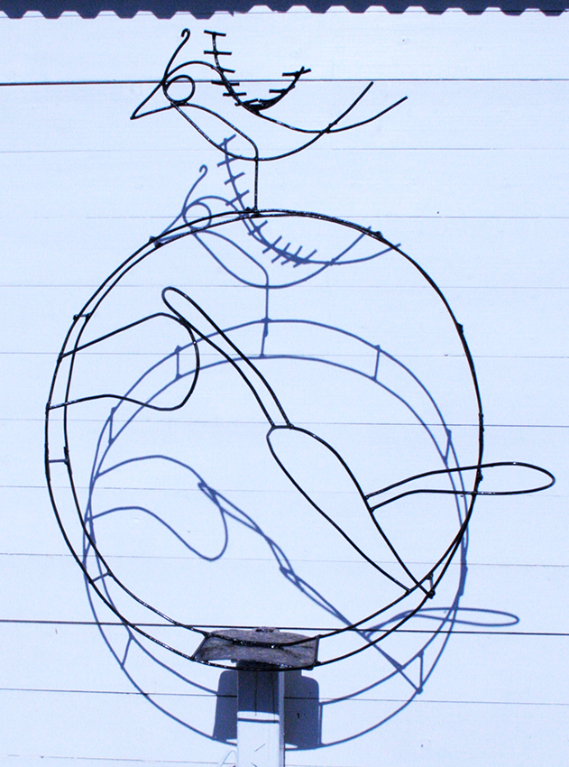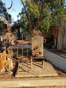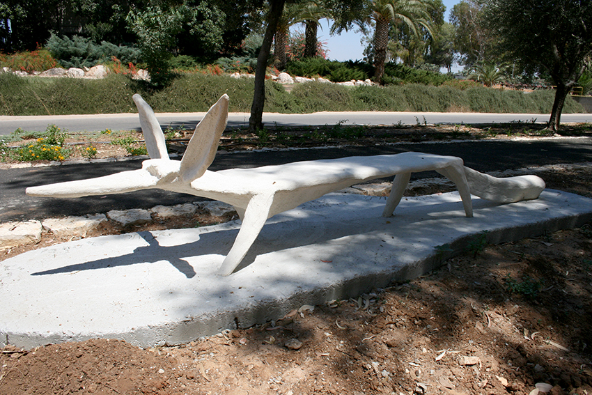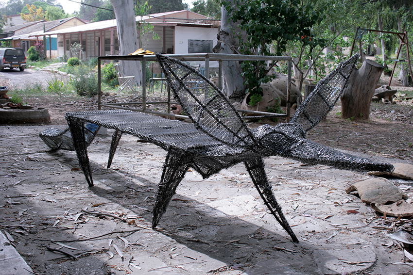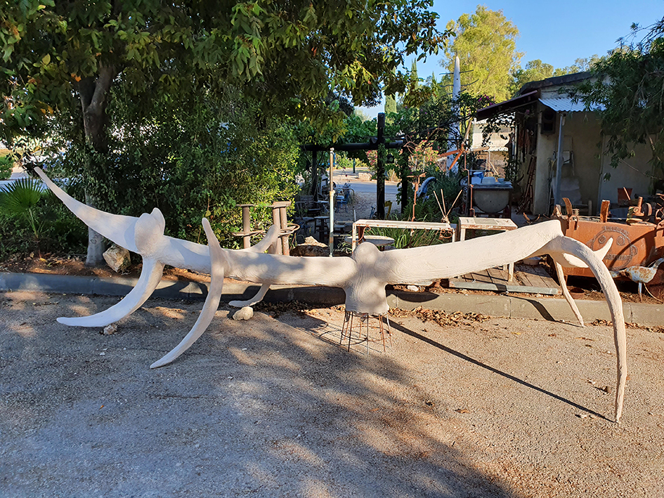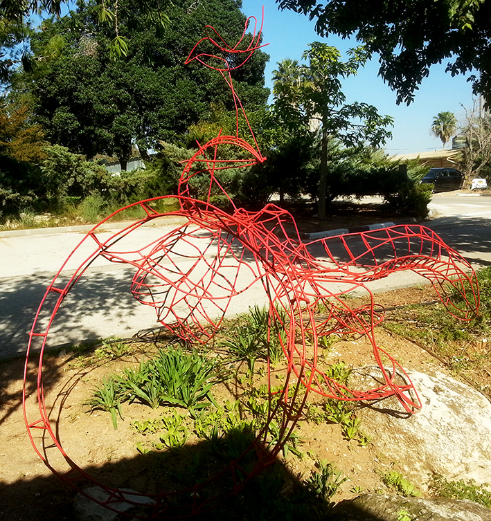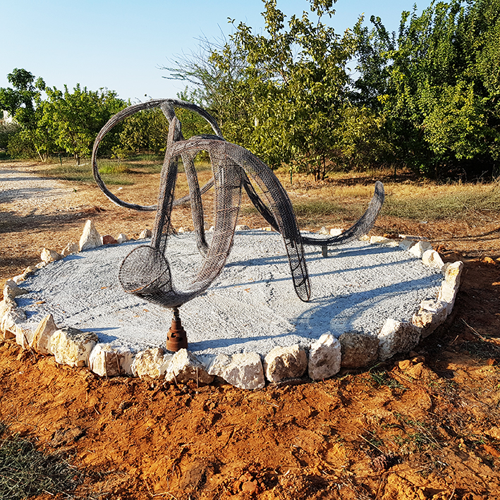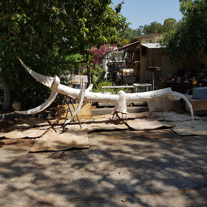 יד. קלקר על שלד ברזל. העבודה נחתכה ונוצקה באלומיניום. החלקים הונחו במתחם ליד בריכת המים של קיבוץ נען.