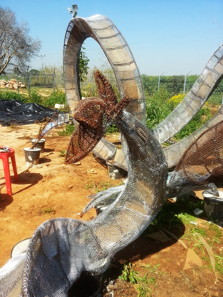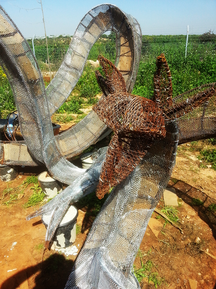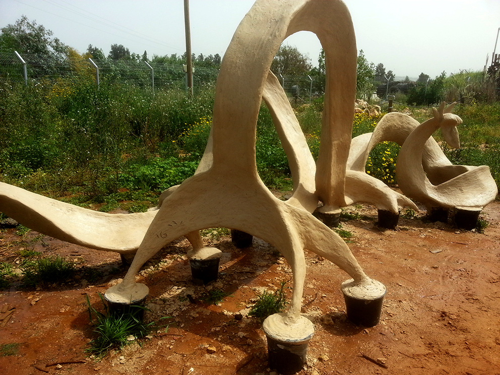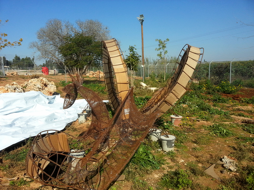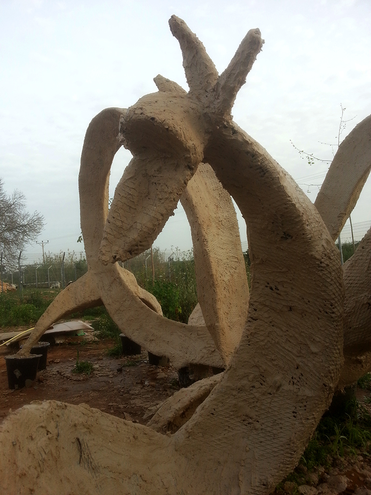 פסל-משחק לילדים הולך ונבנה במשק-חי בנען. אל קונסטרוקצית הברזל מצמידים רשת ועליה שתי שכבות מלט לבן.