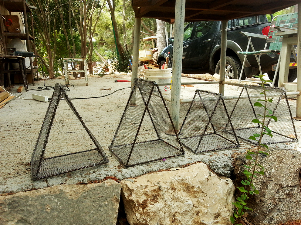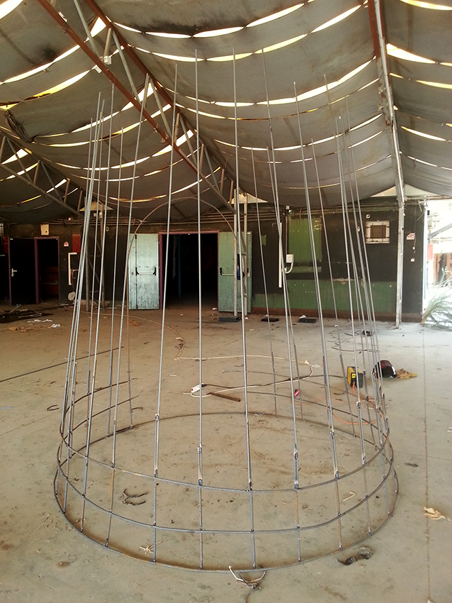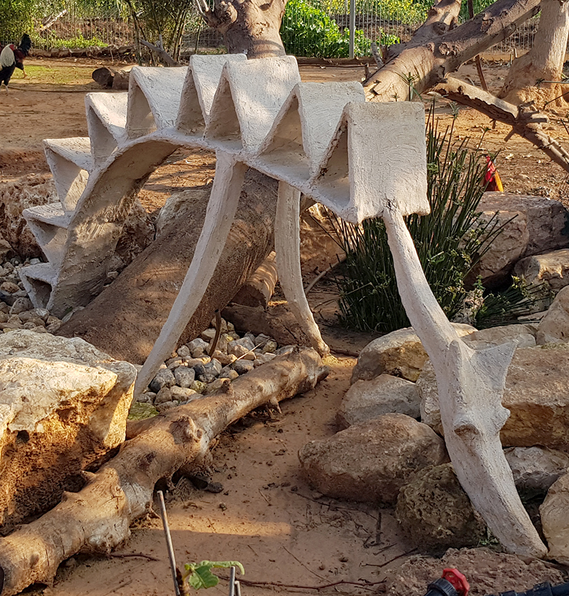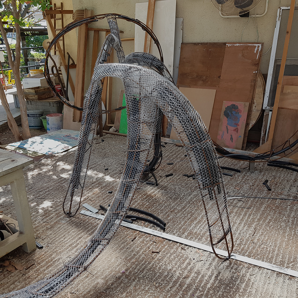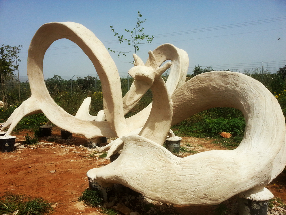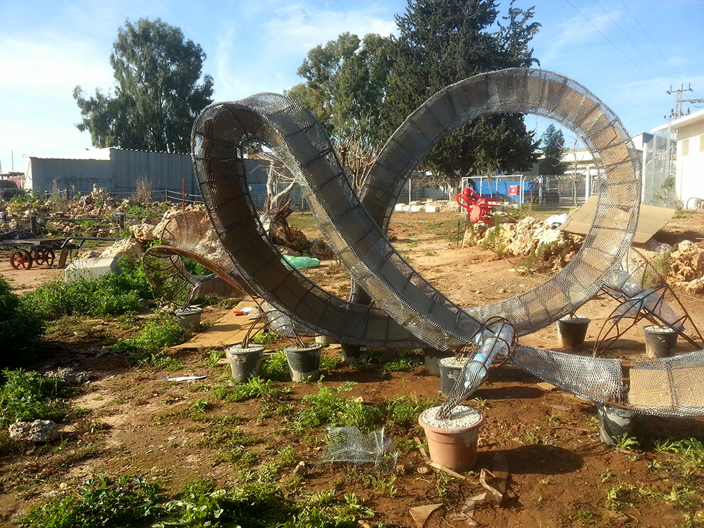 פסל-משחק לילדים הולך ונבנה במשק-חי בנען. אל קונסטרוקצית הברזל מצמידים רשת ועליה שתי שכבות מלט לבן.