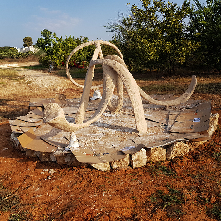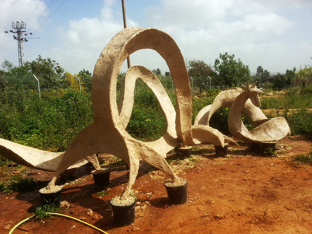 מבט נוסף לפני שכבת בטון אחרונה, שכבה ליצירת טקסטורה וחיזוק המבנה כולו. הפסל הוא חלק מפרוייקט פיסול-משחק לילדים שיכלול ארגז חול ומבנה פיסולי נוסף שממנו אפשר יהיה לגלוש למבנה הנוכחי. תכניות..