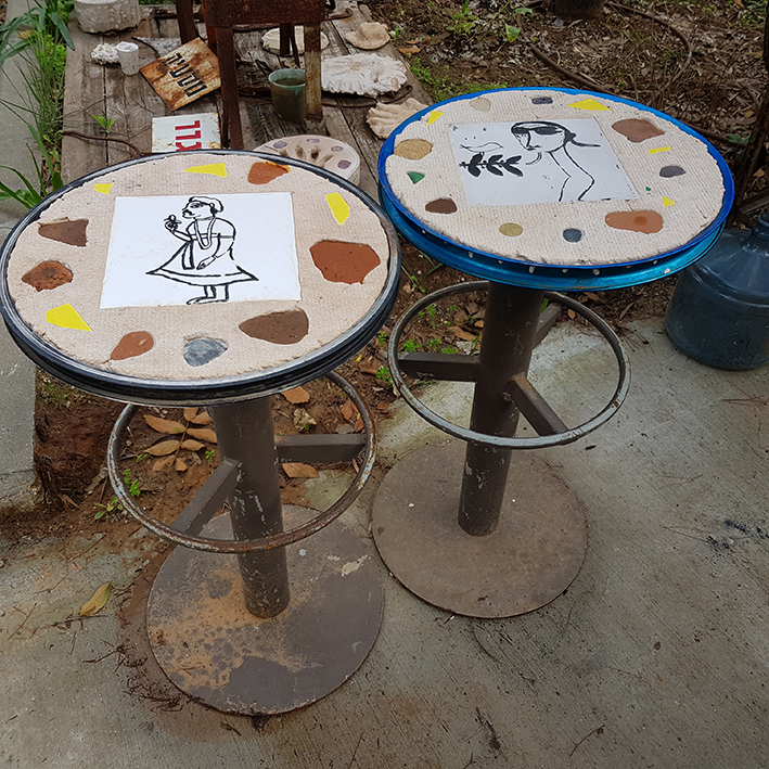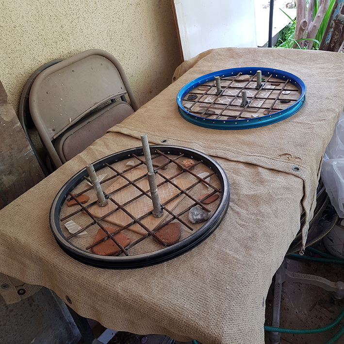 שולחן, אריחי קרמיקה ועלי בטון בתוך חישוק אפניים. קוטר כ-70 ס"מ