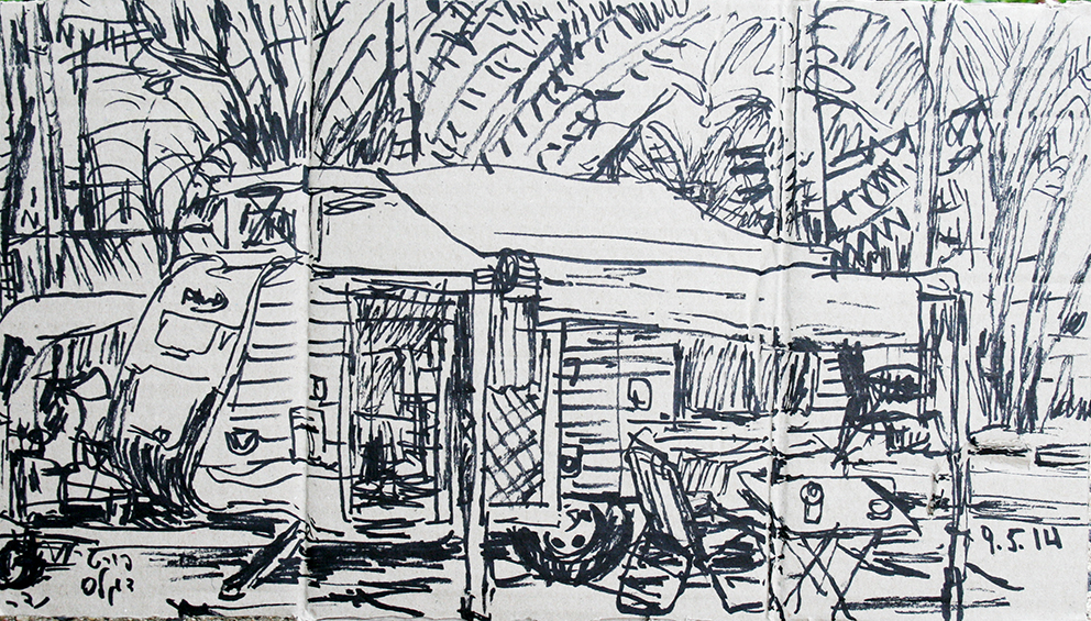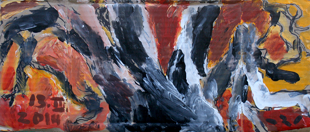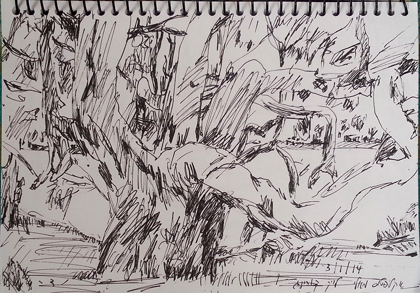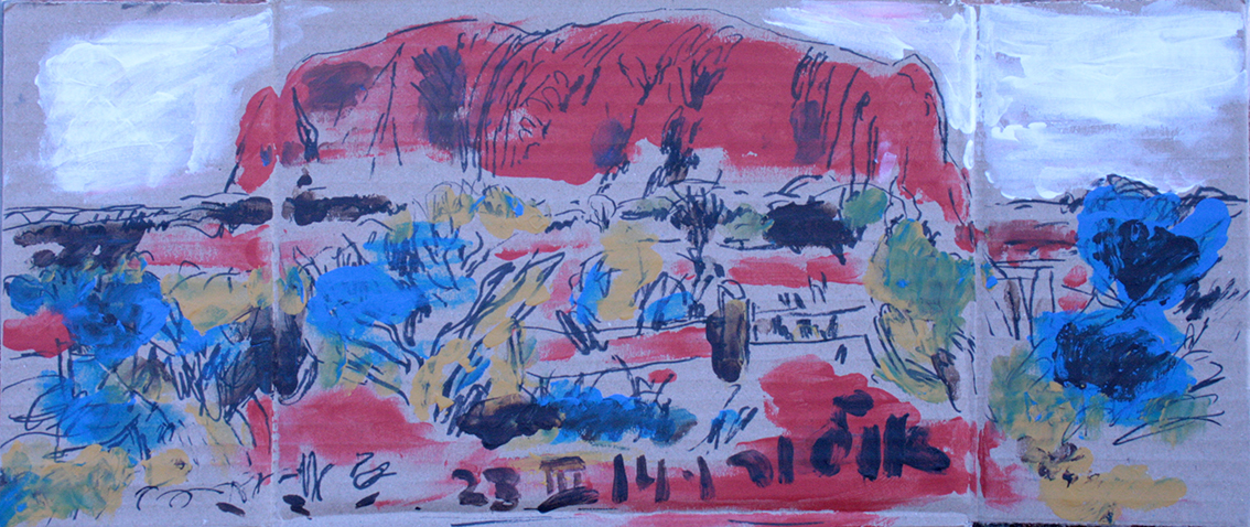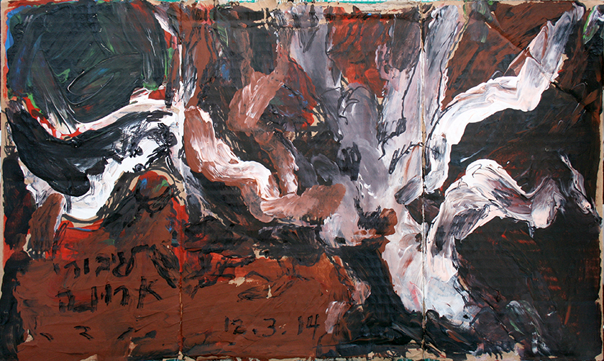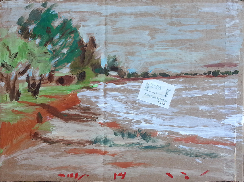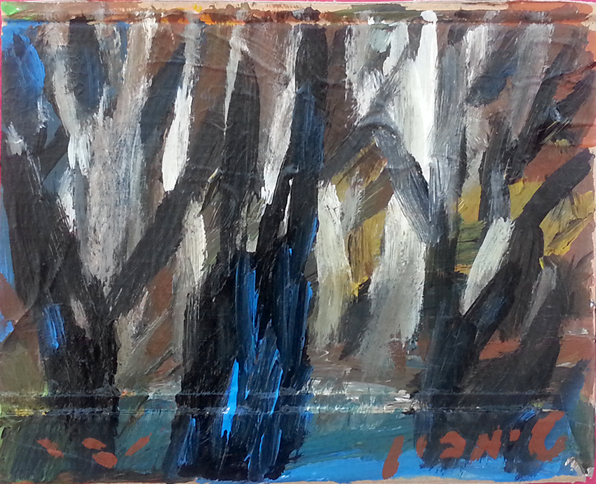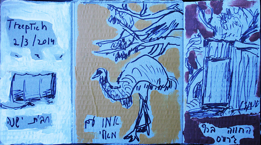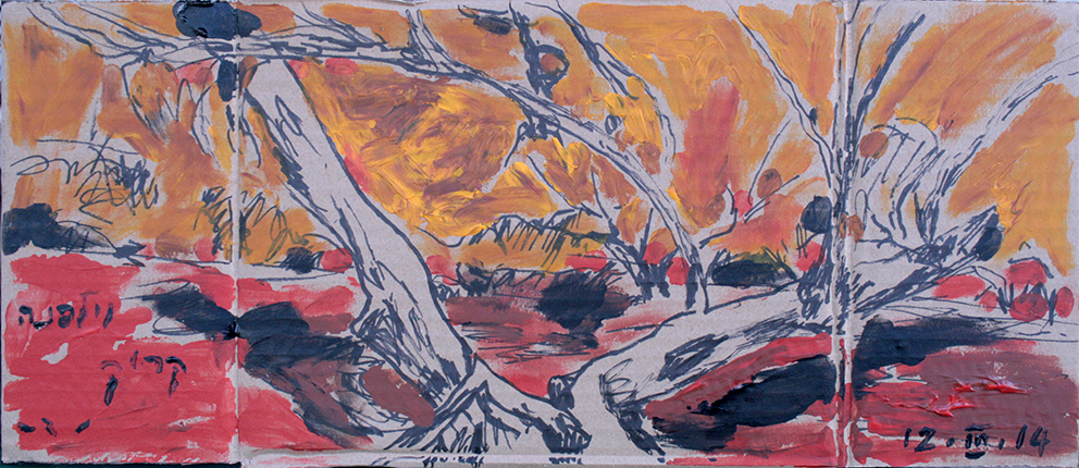 עט ואקריל על קופסת קרטון.אקליפטוס נחלים אדום, וילפנה קריק, עט וצבע אקריל מרוח באצבע על קופסת קרטון.אקליפטוס אדום. עט שחור על קופסת קרטון. צבע אקרילי של מתחילים מרוח באצבע. על אפן וחמתן של הברקודות..טריפטיך, עט שחור ואקריל מרוח באצבע על קופסת קרטון.