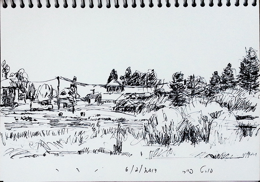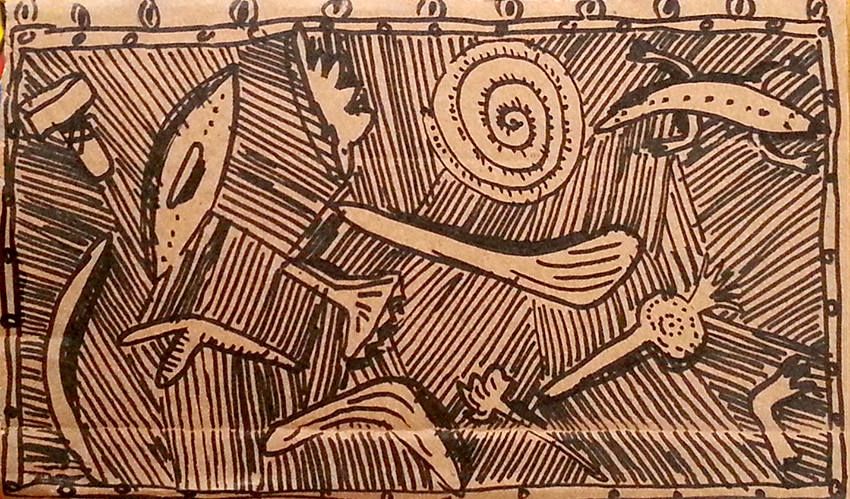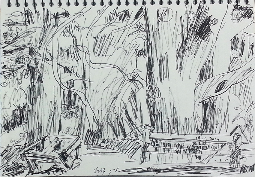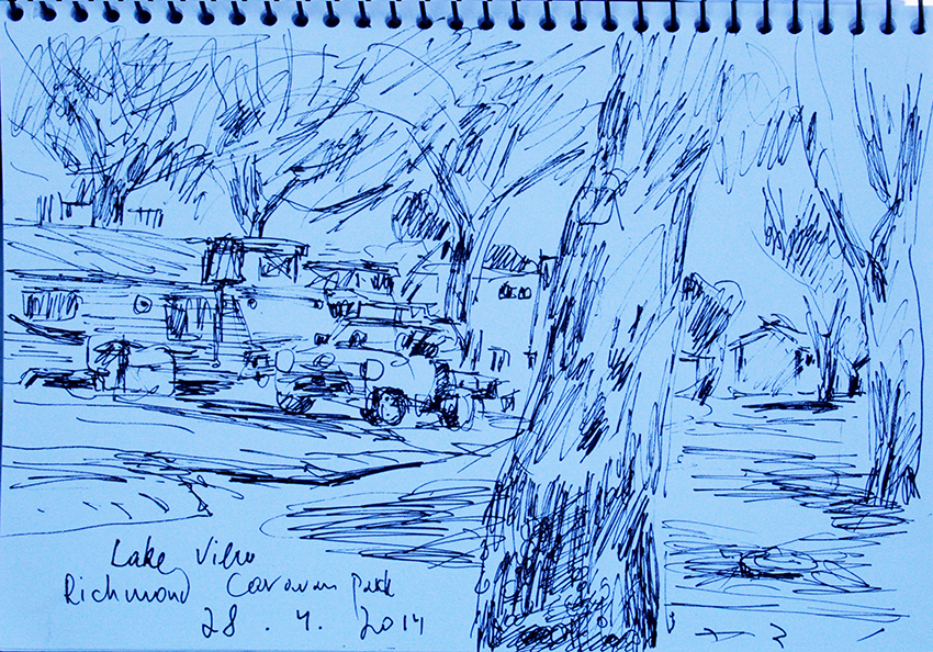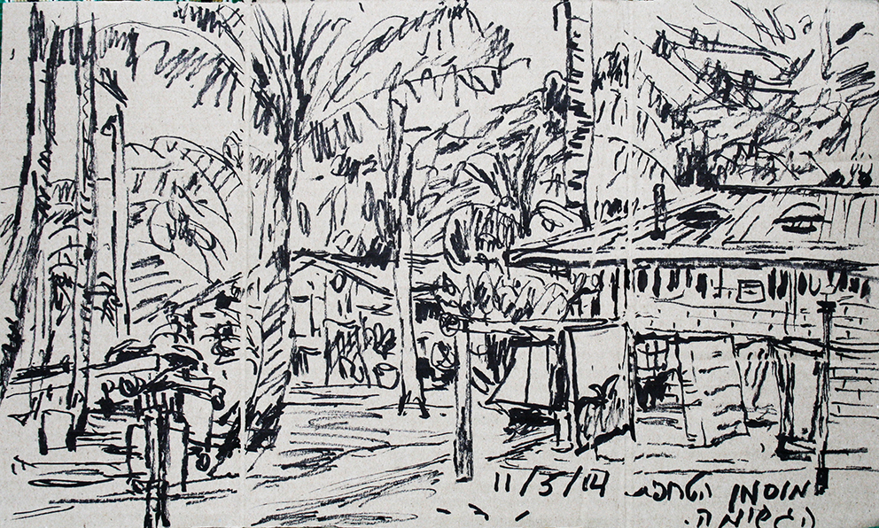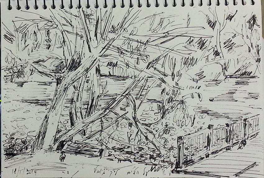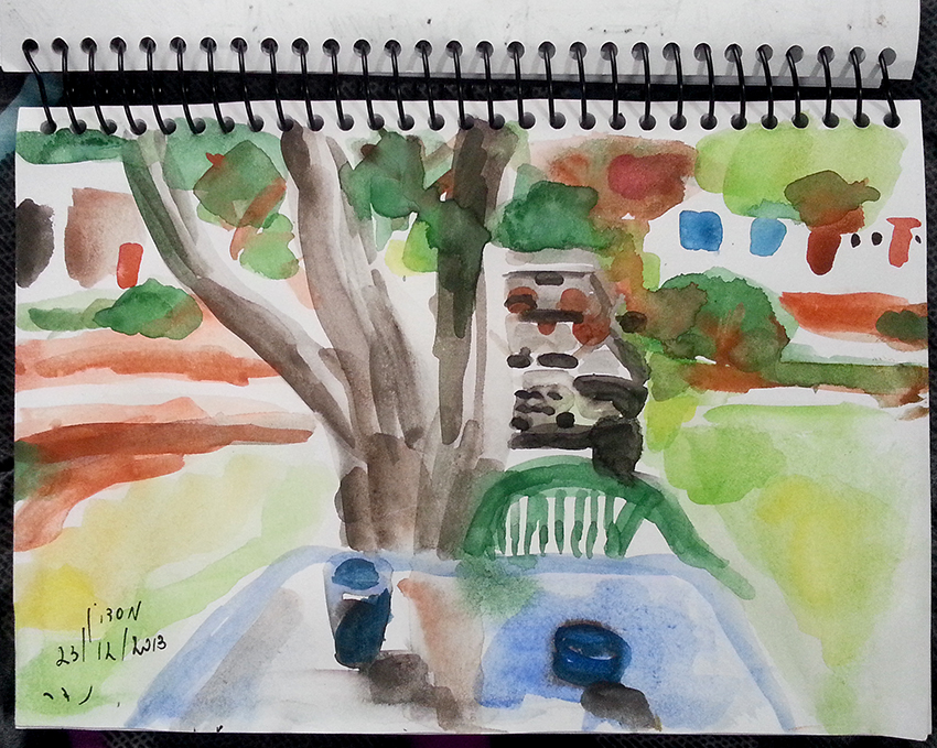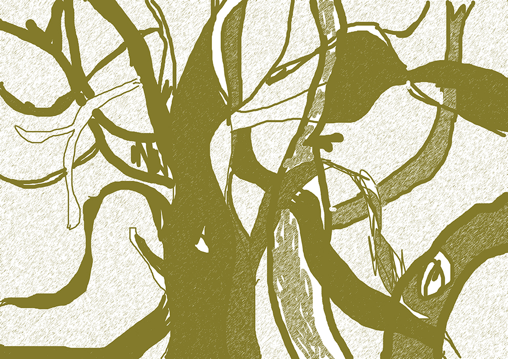 עט ואקריל על קופסת קרטון.אקליפטוס נחלים אדום, וילפנה קריק, עט וצבע אקריל מרוח באצבע על קופסת קרטון.אקליפטוס אדום. עט שחור על קופסת קרטון. צבע אקרילי של מתחילים מרוח באצבע. על אפן וחמתן של הברקודות..טריפטיך, עט שחור ואקריל מרוח באצבע על קופסת קרטון.
