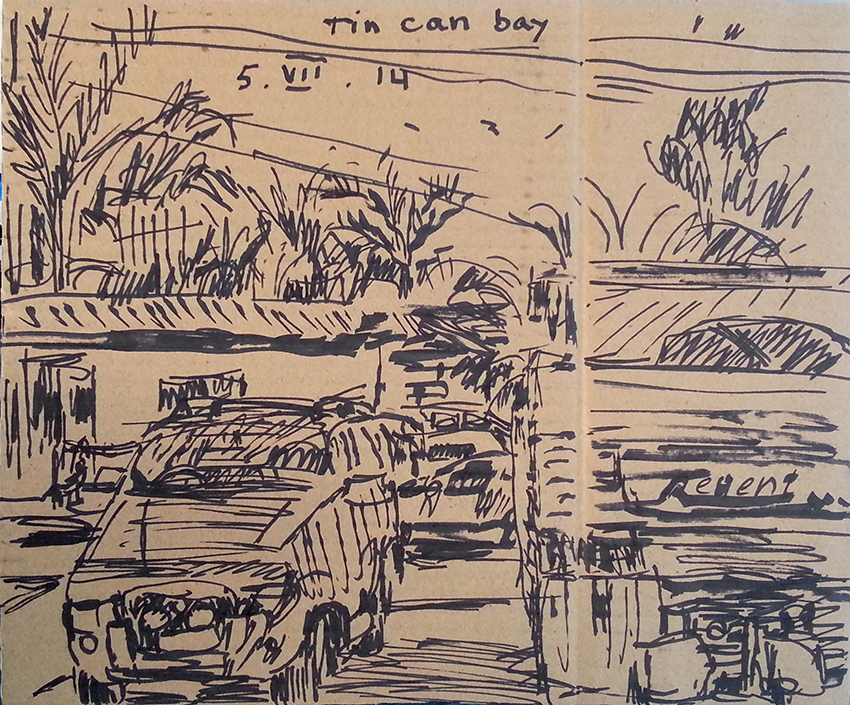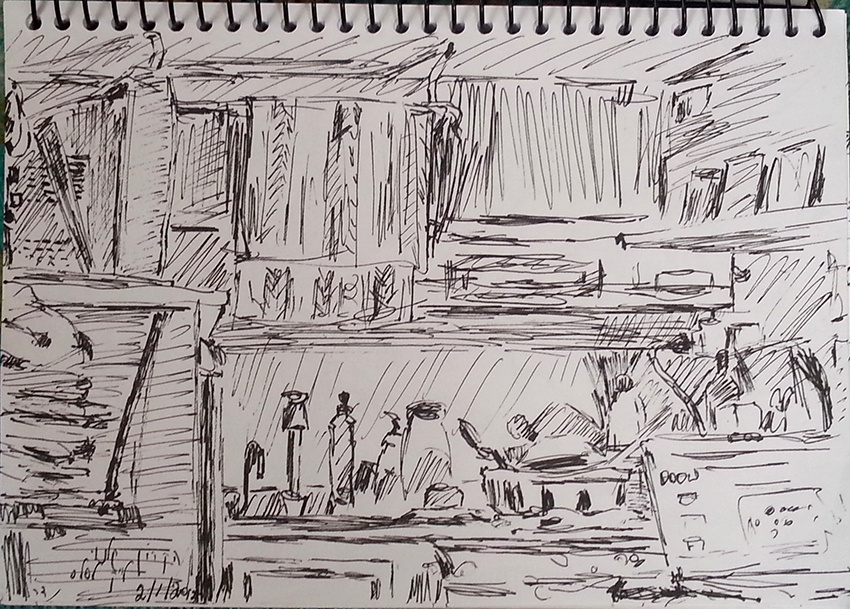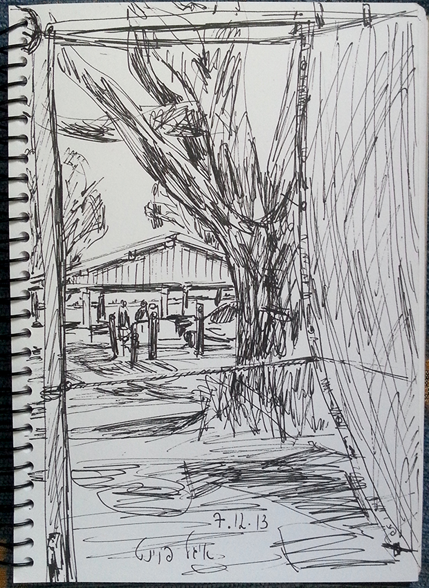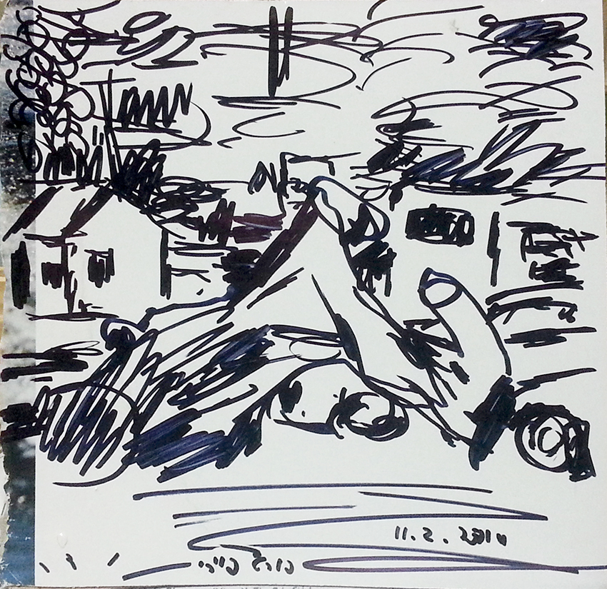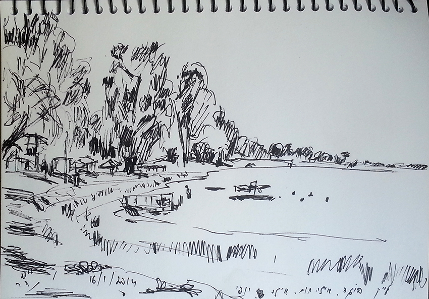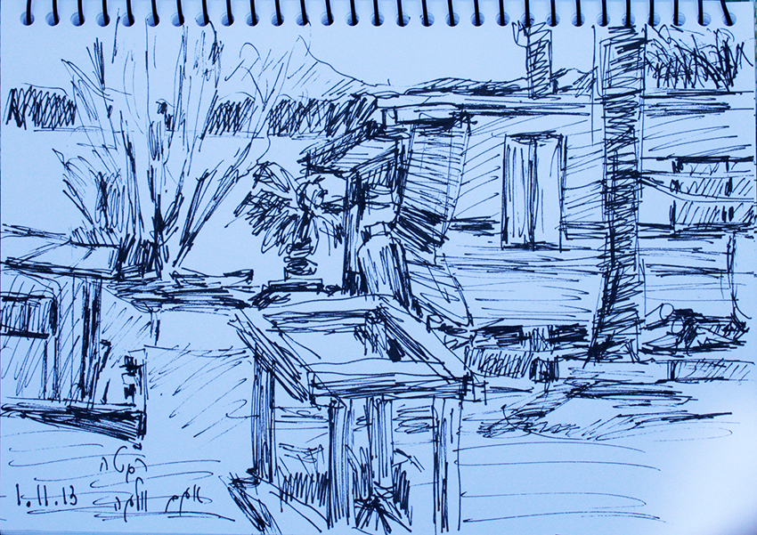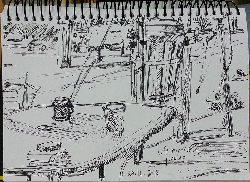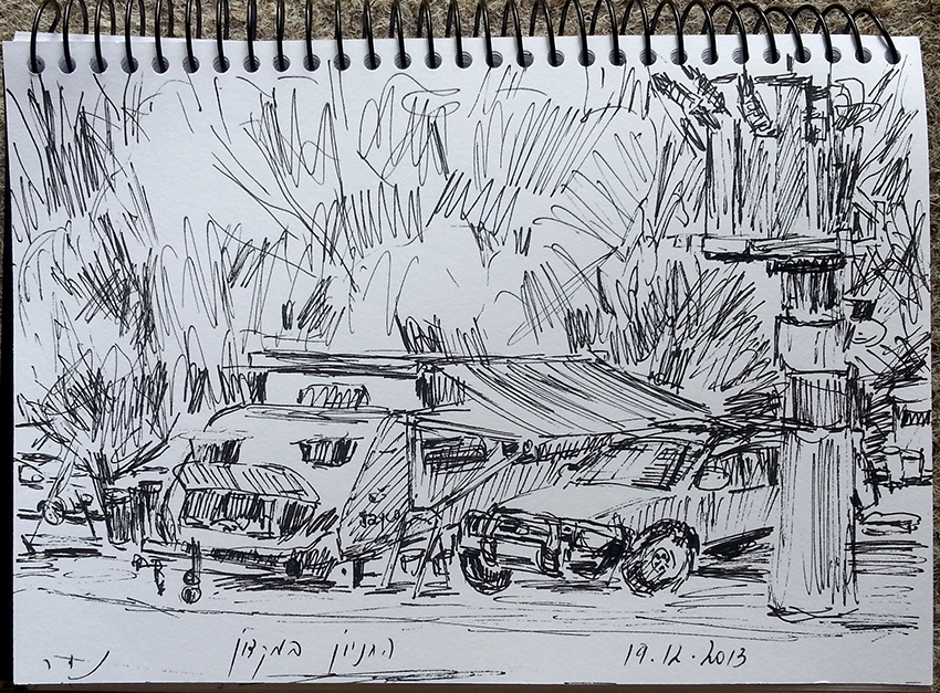 עט ואקריל על קופסת קרטון.אקליפטוס נחלים אדום, וילפנה קריק, עט וצבע אקריל מרוח באצבע על קופסת קרטון.אקליפטוס אדום. עט שחור על קופסת קרטון. צבע אקרילי של מתחילים מרוח באצבע. על אפן וחמתן של הברקודות..טריפטיך, עט שחור ואקריל מרוח באצבע על קופסת קרטון.